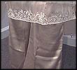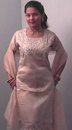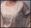 Light colored salwar kameez with intricate machine embroidery around the edges. The embossed embroidery catches the design of the outfit to match the fabric.