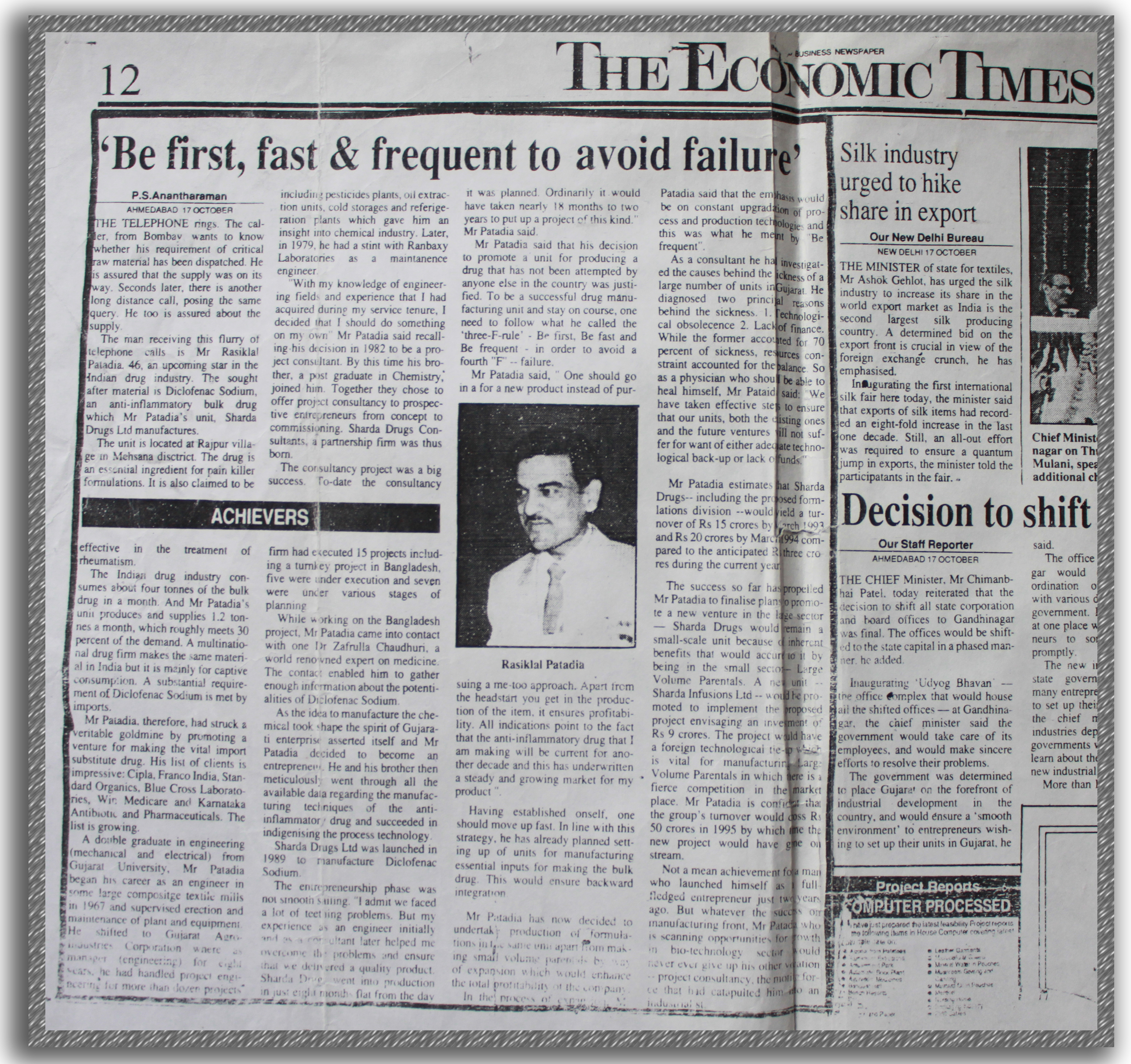 As the idea to manufacture the chemical took shape the spirit of Gujarati enterprise asserted itself and Mr Patadia decided to become an entrepreneur. He and his brother then meticulously went through all the available data regarding the manufacturing techniques of the anti inflammatory drug and succeeded in indigenising the process technology.